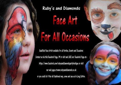 HERE AT RUBYS AND DIAMONDS, WE CAN OFFER THE SERVICES OF EXPERIENCED FACE PAINTERS SUITABLE FOR ANY EVENT, INCLUDING WEDDINGS, CORPORATE EVENTS, CHILDREN'S PARTIES, FUNDRAISERS OR ANYTHING ELSE YOU CAN THINK OF!